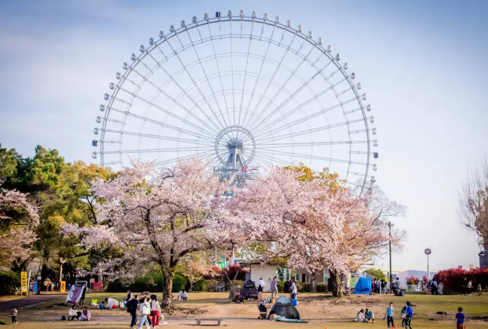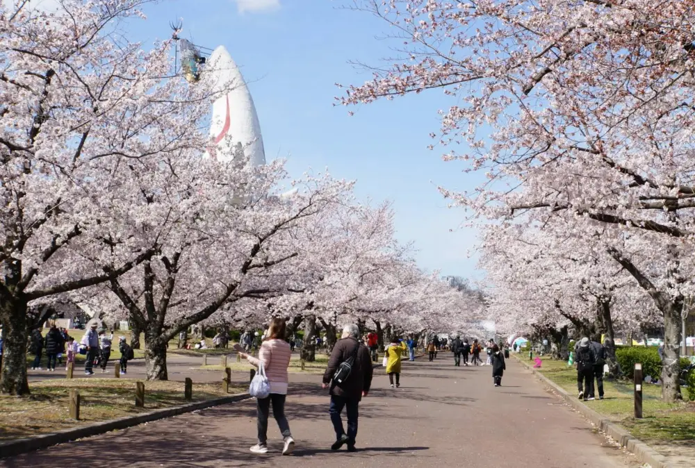 如果想避開大阪市區的人擠人,搭乘單軌電車前往萬博紀念公園是不錯的選擇。這裡是 1970 年萬博會的遺址,巨大的「太陽之塔」聳立在 5500 株櫻花樹中,充滿了強烈的藝術感與超現實氛圍。公園內種植了九種不同的櫻花品種,花期相對較長,加上廣闊的草坪與自然生態,非常適合帶著便當來這裡鋪上野餐墊,享受一個無拘無束的午後時光。