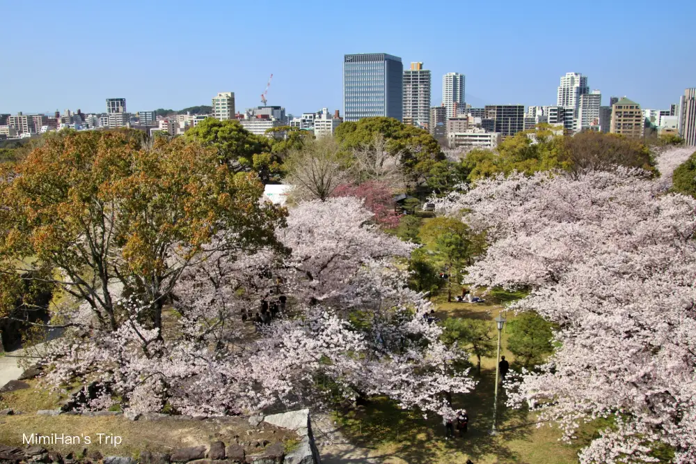 作為日本三大名城之一,熊本城的賞櫻體驗充滿了力量與重生的感動。深黑色的天守閣與粉白色的櫻花形成強烈對比,視覺效果極為震撼。雖然城堡仍部分在修復中,但透過特別設置的高架木棧道,遊客能以獨特的視角近距離欣賞石垣與櫻花。站在加藤神社前,看著屹立不搖的天守閣被花海包圍,那種莊嚴又溫柔的景色,絕對值得專程前往。
