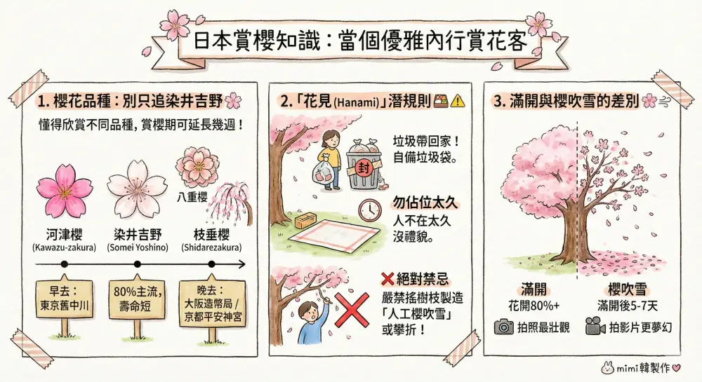 雖然日本80%櫻花都是粉白色的「染井吉野櫻」,但它壽命最短。如果妳太早到,可以找粉紅色的「河津櫻」(如東京舊中川);如果晚到,就去找花瓣層層疊疊的「八重櫻」(如大阪造幣局)或像柳樹般垂下的「枝垂櫻」(如京都平安神宮、圓山公園)。懂得欣賞不同品種,妳的賞櫻期可以再延長幾週