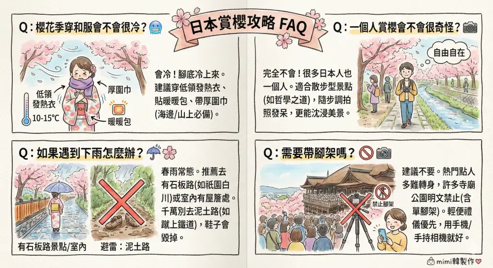 完全不會!其實很多日本人也是一個人賞櫻。像京都的哲學之道、東京的目黑川,這種「散步型」的景點非常適合獨旅。妳可以依照自己的步調拍照、發呆,不用顧慮旅伴累不累,反而更能沈浸在美景裡。