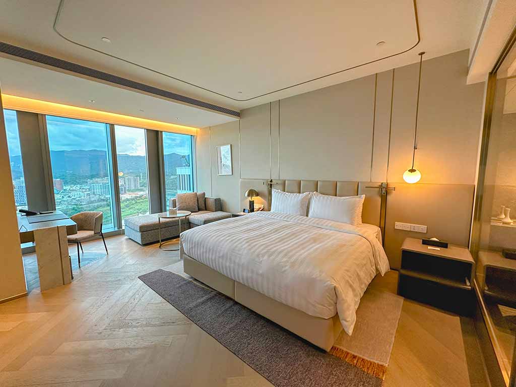 房內的科技配置更是一大亮點,導入「Ai智能管家小美犀」整合環控系統,房客只需透過語音即可開關燈光、播放音樂或查詢周邊美食。此外,衛浴空間選用美國百年品牌KOHLER浴缸與日本INAX免治馬桶,並提供香氣細緻的法國DAMANA或奢華品牌BVLGARI備品,從五感細節寵愛每一位入住者。