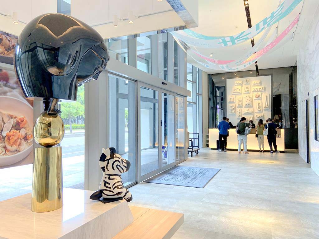 整體室內設計以黑白色系為基調,運用流動的線條與幾何色塊,營造出如同現代藝廊的時尚感。更令人驚艷的是,飯店將每一層樓的梯間轉化為展示藝廊,不同樓層擁有各異的展覽主題,讓房客從踏出電梯的那一刻起,便能感受到濃郁的藝術驚喜。