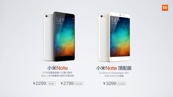 小米公司今日1月15日發表5.7吋螢幕的全新旗艦機小米Note,依照容量的不同,售價為2299/2799人民幣,同時發表小米Note頂配版,配備高通 Snapdragon 810 8核64-bit處理器、4GB RAM、5.7吋2K大螢幕、解析度達 2560 x 1440,售價3299人民幣。