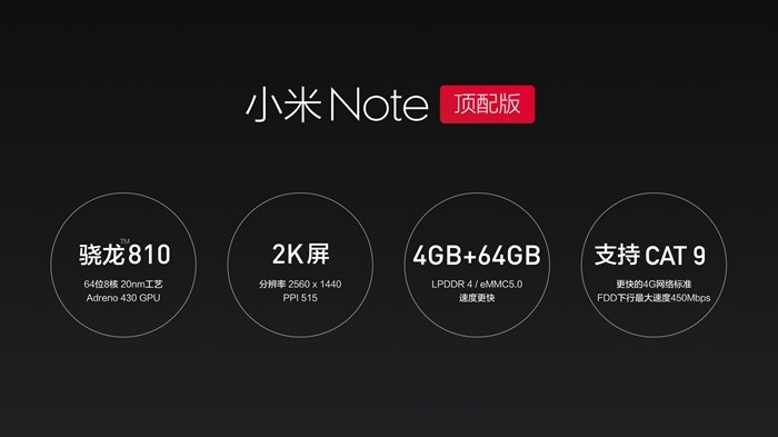小米Note頂配版使用5.7吋2K大螢幕,解析度達 2560 x 1440,PPI高達515。搭載Snapdragon 810 8核64-bit處理器,配備Adreno 430圖形處理器,比上代性能提升80%,功耗降低30%。