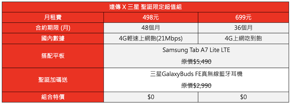 遠傳平板方案耶誕同步加碼,攜手三星聯手推出耶誕好禮,即日起到 12 月 31 日,到遠傳入手 Galaxy Tab S9 FE、Galaxy Tab A8 2022 等三星平板,並搭配遠傳指定資費方案,專案價最高現折千元。另推出三星平板+藍牙耳機耶誕限定超值組合,搭配月付 498 元享輕速上網吃到飽或月付 699 元享上網全速飽,Galaxy Tab A7 Lite LTE 平板電腦及最新三星 Buds FE 藍牙耳機超值組,0 元就能帶走,聽說讀寫課程樣樣行、智慧學習一把罩!
