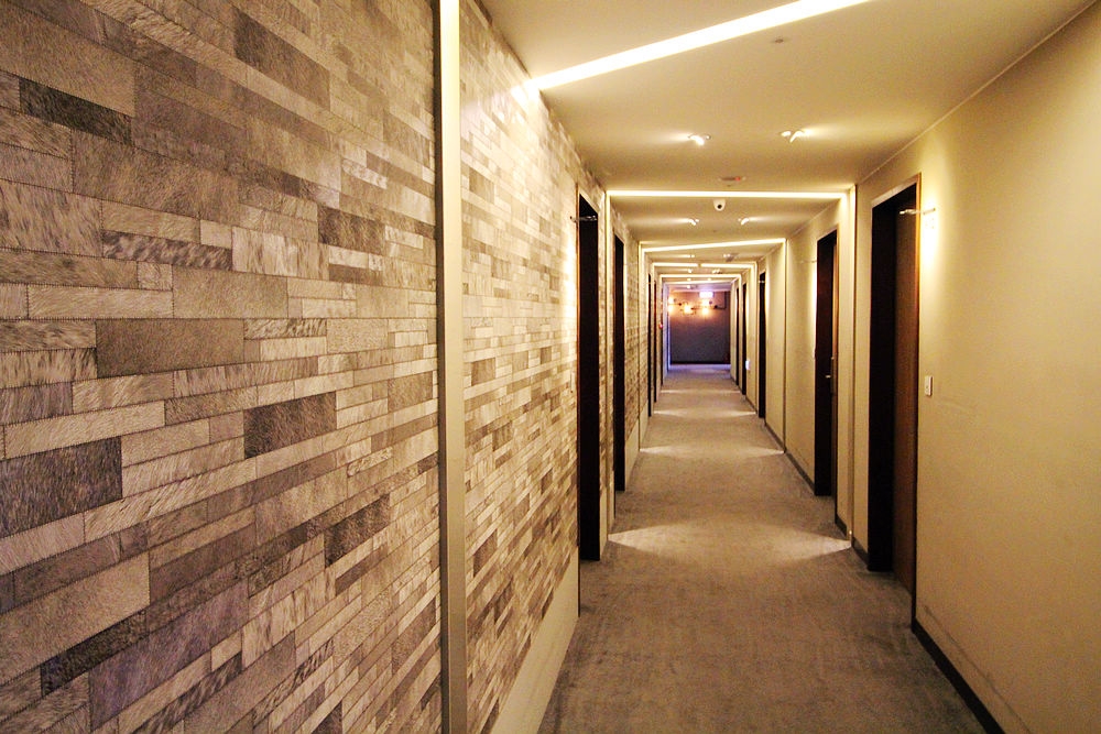 連走廊的牆壁都很講究,摸起來有不同的質感。