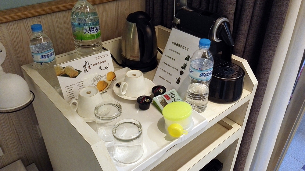 房間可以自己煮開水,還提供了很多瓶礦泉水,不夠的話可以跟櫃檯說唷!這對於需要泡奶粉的小家庭來說真的很棒,而且還提供了膠囊咖啡機,都是免費做使用的唷!(怕你喝不完而已…)