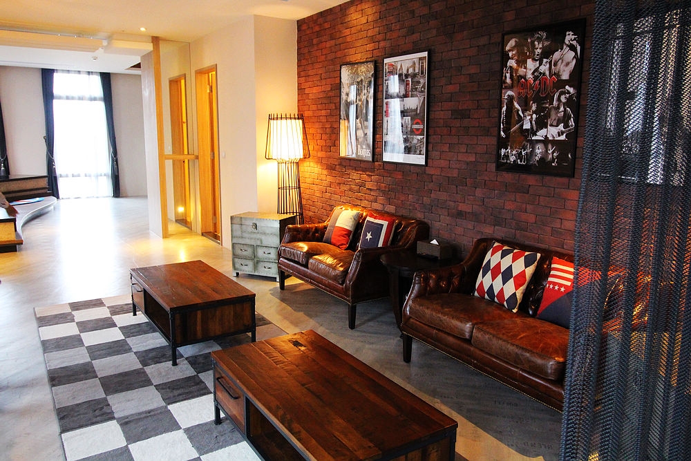 趁這個機會來順便看看其他房間的設計,這是老爸老媽他們住的房間,真的是工業風啊!這是九號旅店的「玩客雙人客房(兩小床)」,後面的木造牆壁上有許多國家的名稱。