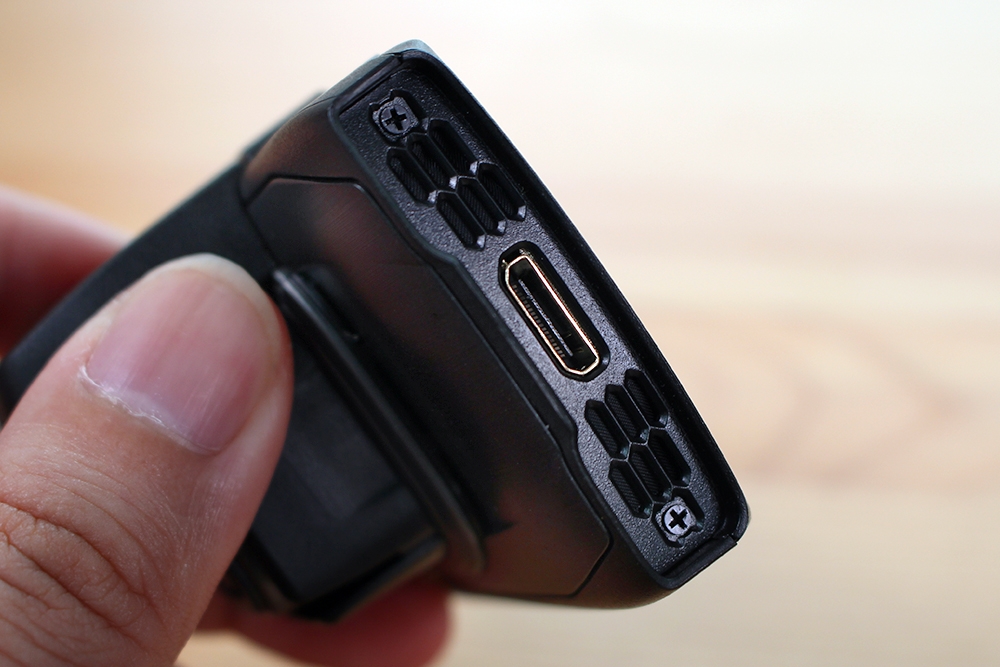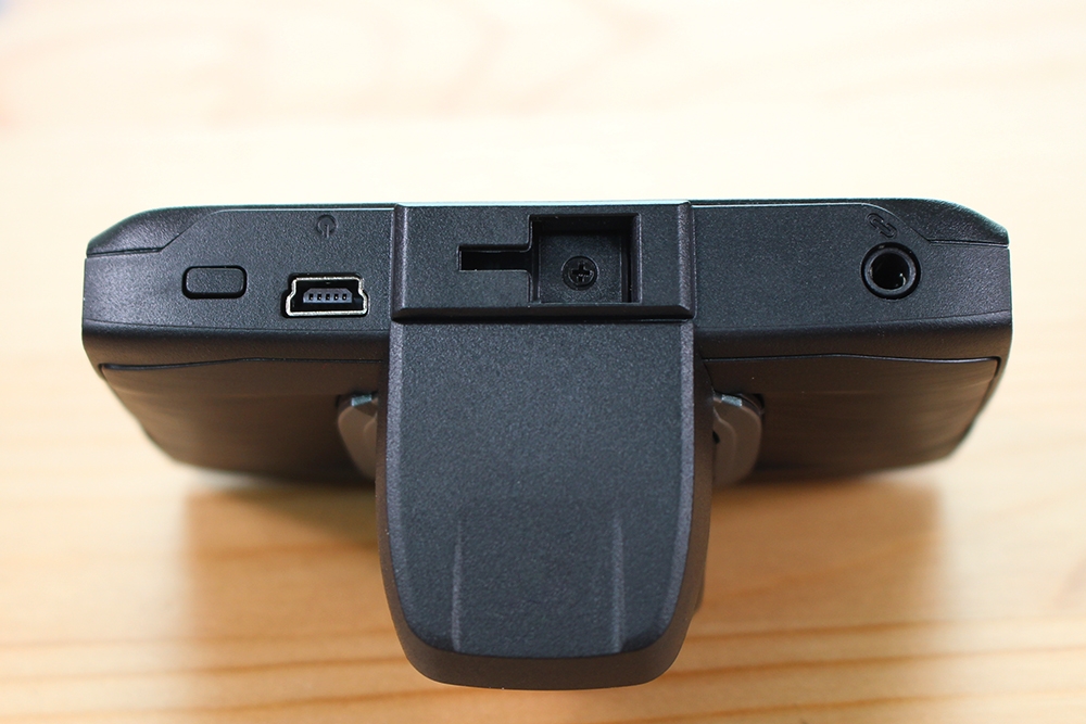 機身的上方中間為支架固定的卡榫,左邊是 mini USB 電源,右邊則是可以和胎壓偵測器連結的支援套件接口。