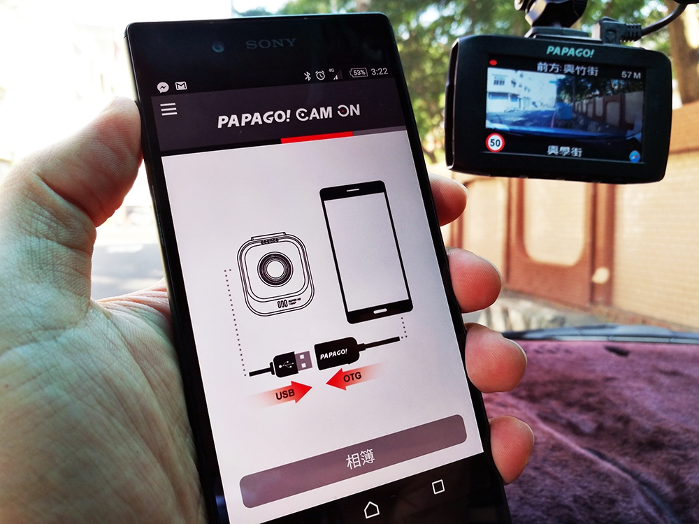 連結 OTG 傳輸線後,只要下載 PAPAGO! 免費 APP「CAM ON」後,就能在手機上看相關影片和照片,能讓我們即時分享在社群網站上。