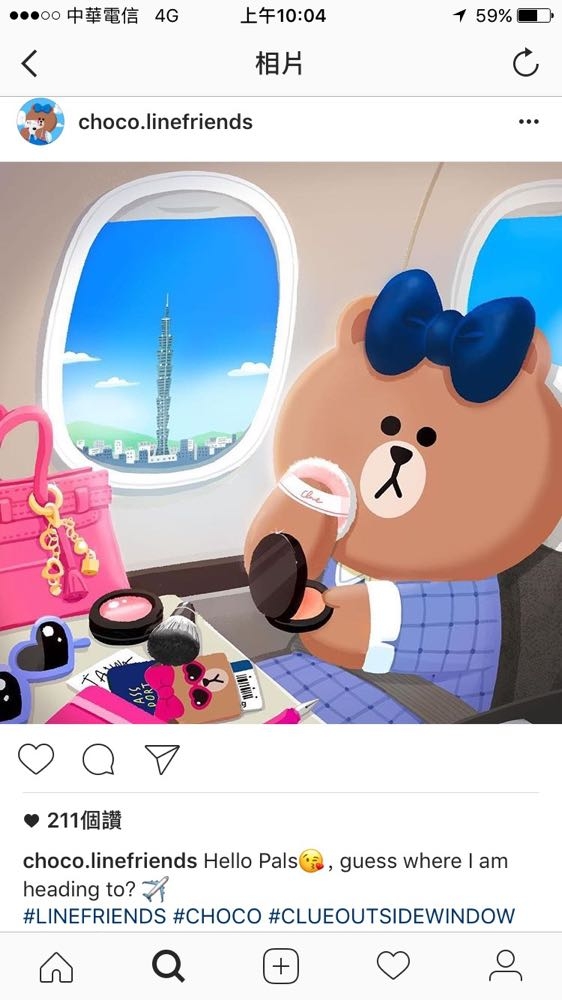 熱愛使用社群媒體的 CHOCO,自三月份開啟 Instragram 帳號之後,開始頻繁地分享日常的生活點滴,不僅時常上傳與朋友聚餐的照片,從其他發佈的照片更可以發現 CHOCO 在短短的 9 個月內已經造訪了義大利、美國、英國、中國、香港等全球各地。從最新的一張 PO 文觀察,精心打扮穿著藍色格紋洋裝,搭配靛藍色蝴蝶結頭飾和桃紅色手提包的 CHOCO 正在機艙內補妝準備以最完美的姿態現身,而窗外台北 101 的樣貌和桌上紙張隱隱約約可以看出的 Taiwan 字樣,透露出 CHOCO 即將來到台灣與朋友們相聚。