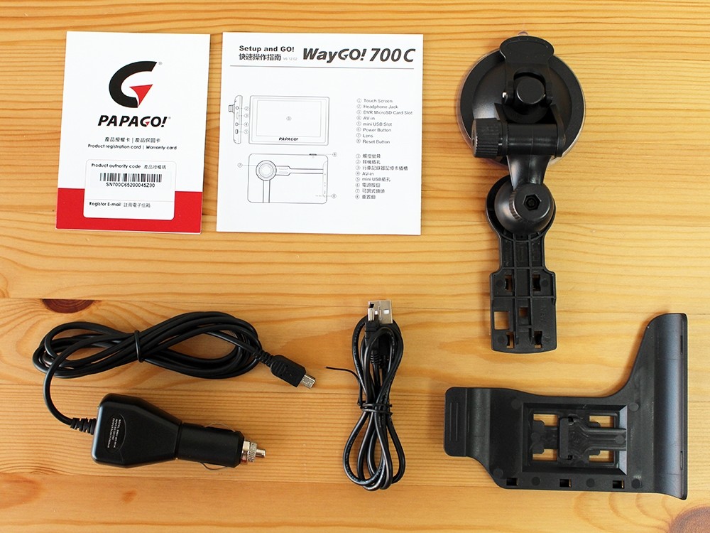 除了 7 吋的 PAPAGO WayGO 700C 聲控衛星導航行車記錄器主體之外,盒內配件包含玻璃吸盤固定架、固定車架、說明書與操作指南,電源方面提供了一般的點菸器電源以及 Mini USB 傳輸線,若車上已經安裝了點菸器轉 USB 的轉接頭,也可以直接使用 Mini USB 線安插充電。