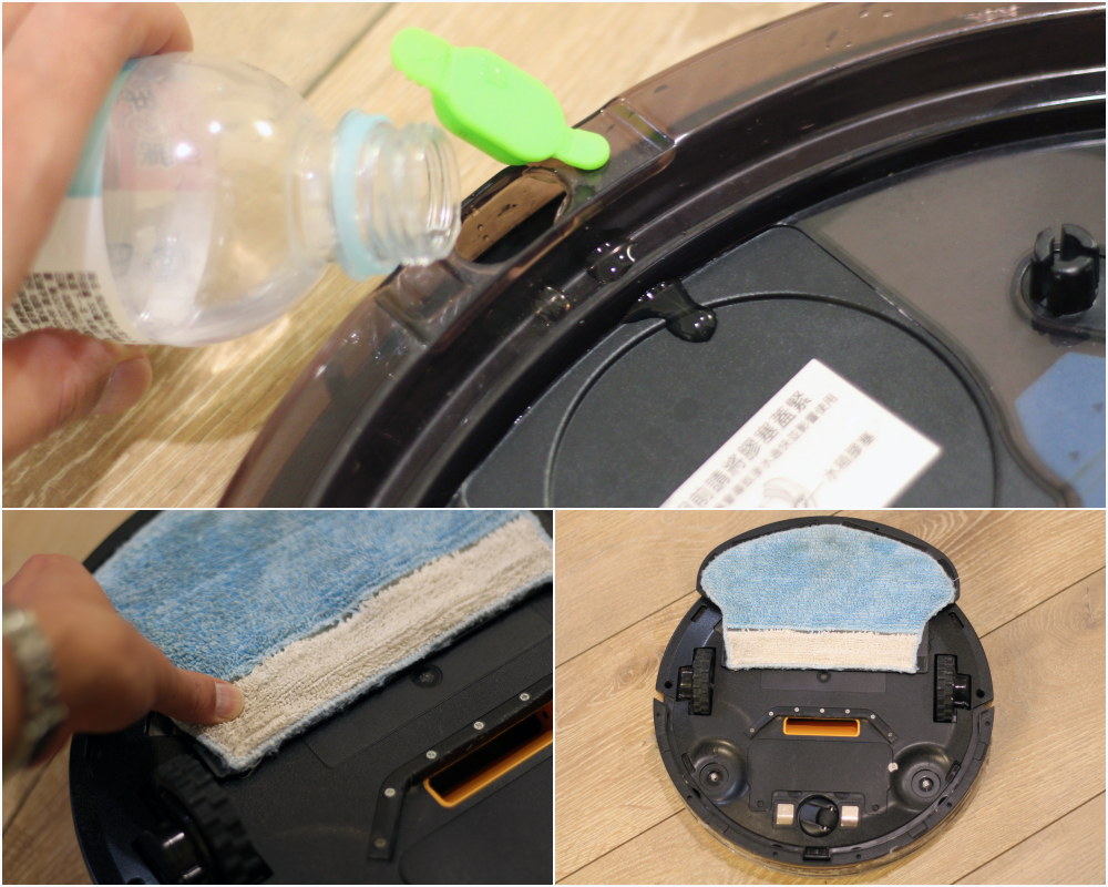 安裝方面真的簡單到不行,比較特別的是居然有濕拖、乾擦的功能,掃地加長型的邊刷是簡單地直接扣合,而如果搭配水箱和乾濕兩用抹布就多了「拖地」的功能,藍色的部份是乾擦、白色的部份則是濕拖,如此一來真的是掃、吸、拖、擦一次到位!