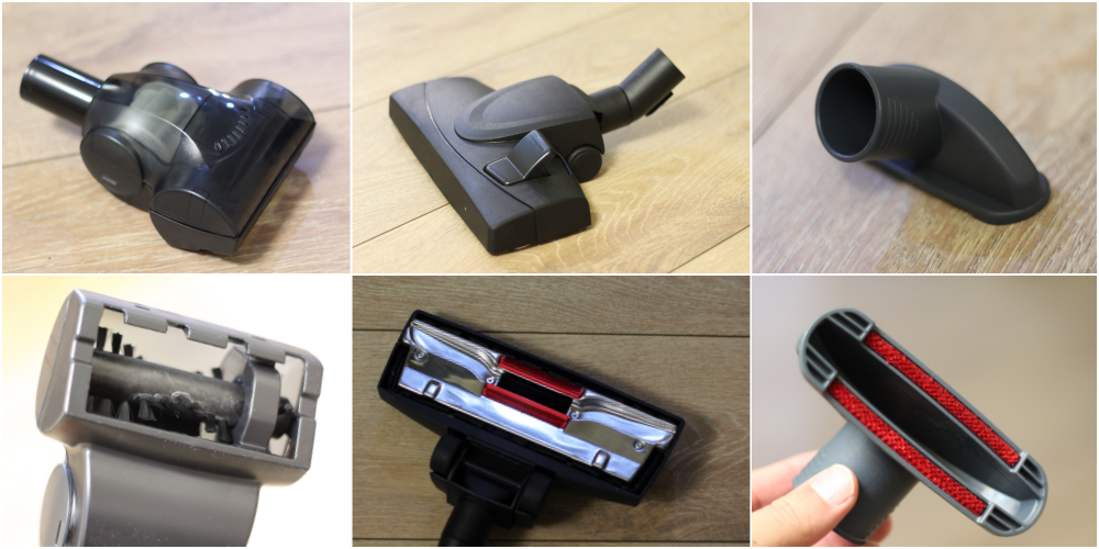 其中包含了大的金屬地刷、細絨式家具刷、內赴滾筒刷毛的清潔刷以及架在機身上的複合式扁平刷,都有他們的功用,根據不同的需求都有適合的設計刷頭。