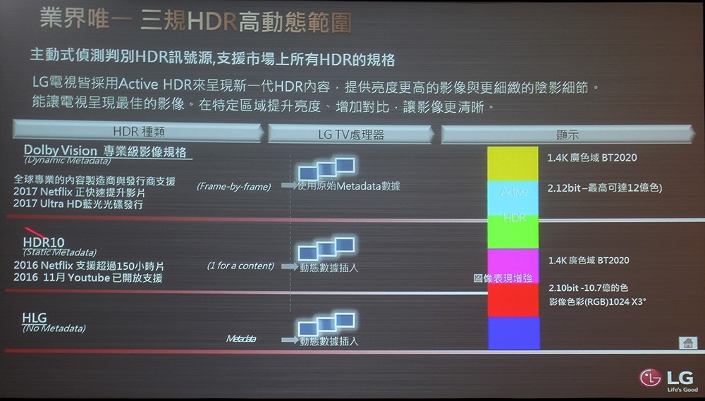 聽了發表會的解說,今天也更了解 Active HDR(高動態範圍)技術了,LG 更是採用主動式偵測判別 HDR 訊號源,而且支援市場上最新 HDR 規格,LG SUPER UHD TV 同步支援三種不同 Active HDR 標準,讓我們在視覺上能夠有更高的爽度,看電影好像人擺進去螢幕裡面,整個都跟真的一樣了!