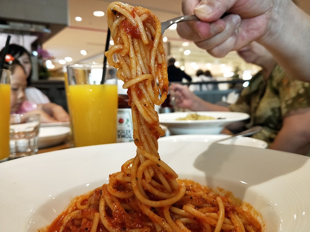 好了!不管她了,接著主食要來啦!也是我們家以前最常點的「蕃茄香蒜義大利麵」,這個口味真的是吃不膩來著,醬料很有香氣,連丈母娘都問服務生有沒有單賣那個醬的~