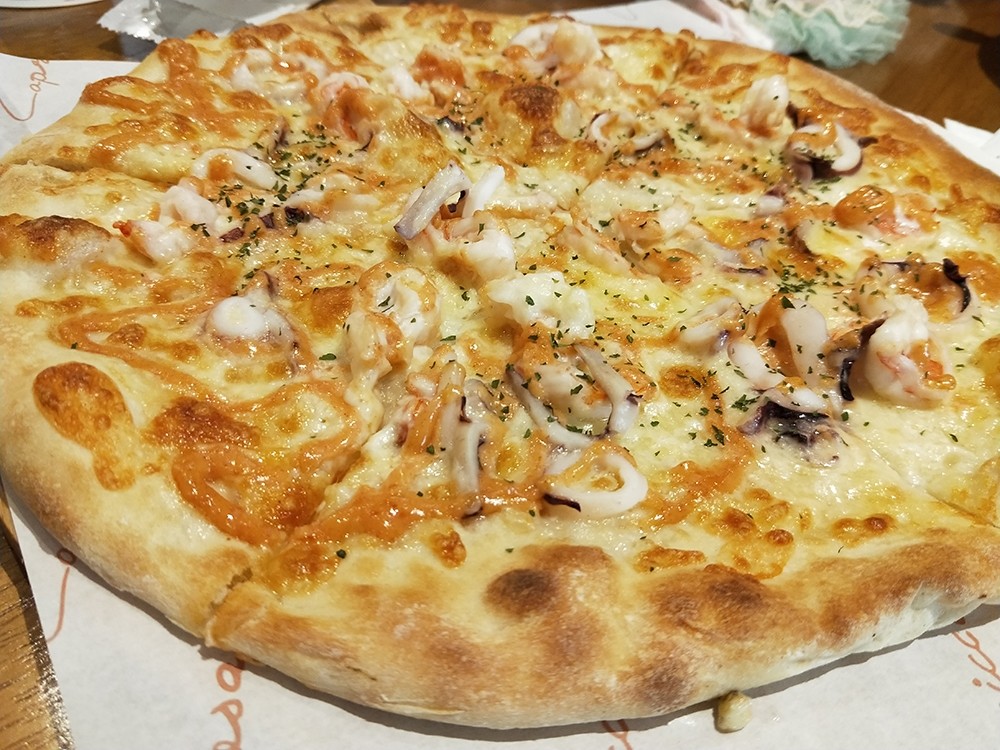 當然絕對不能錯過卡布里喬莎新竹站前 SOGO 店他們家的 Pizza 啦!因為岳母想要吃海鮮類的口味,所以我們就點了這個