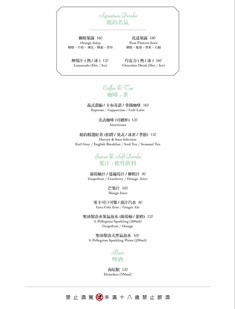 飲料部分有紐約名氣的飲品,像是現打果汁和巧克力,另外還有咖啡和茶可以選擇。