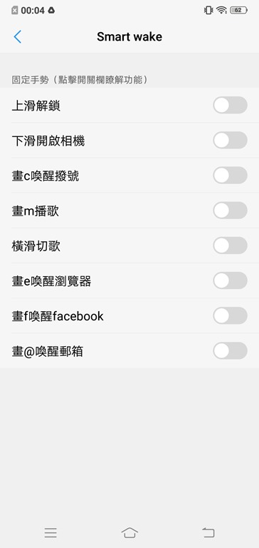 有些人習慣利用一些智慧操作功能來操作手機,因此 Vivo V11 也提供了不少設定讓手機使用更順手,例如可以選擇要不要拿起手機就喚醒螢幕、還是要按兩下才喚醒螢幕,如果時常使用手電筒功能的人,則可以開啟搖晃手機開啟手電筒功能,另外還有多種螢幕手勢功能,例如畫 c 可以喚醒撥號、畫 f 開啟 facebook、畫@開啟郵件 app 等等。