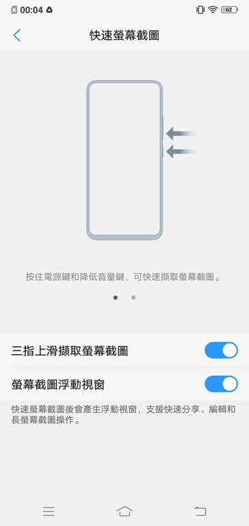 從設定裡也可以調整截圖方式,如果不想要按著電源鍵和降低音量鍵來截圖的話,也可以開啟三指上滑擷取螢幕截圖,截圖後如果不想要有浮動小視窗的話,也可以在此關閉。