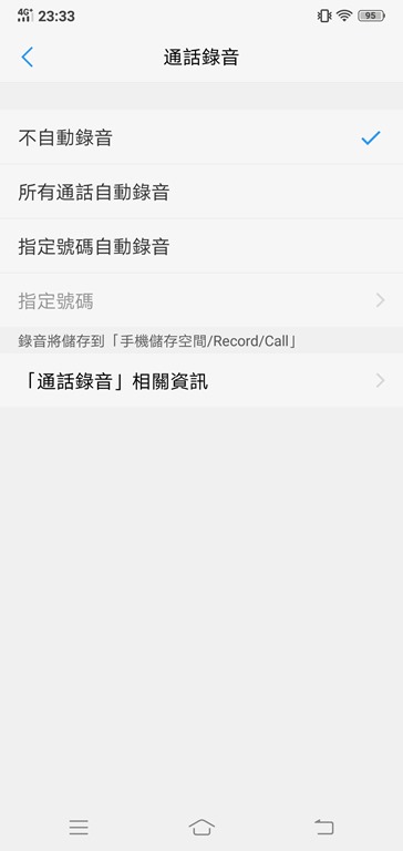 另外,在設定裡面還有一個實用的通話錄音功能,以往通話錄音得要額外下載 app 來使用,有些通話錄音 app 品質不穩定,可能只能錄到對方的聲音,也可能只能錄到自己的聲音,不過用 V11 內建的通話錄音功能就不用擔心這種情況,對話雙方的聲音都可以清楚錄下,還可以從設定中指定要所有通話都錄音還是要指定的電話才錄音,對於有相關需求的人簡直是通話錄音神器。