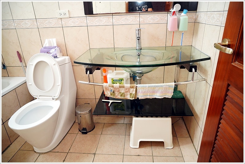 ▼玻璃檯面真的很難整理,堂姐還千交代萬交代以後買房子千萬不要買這種有玻璃檯面設計的廁所(笑翻)!