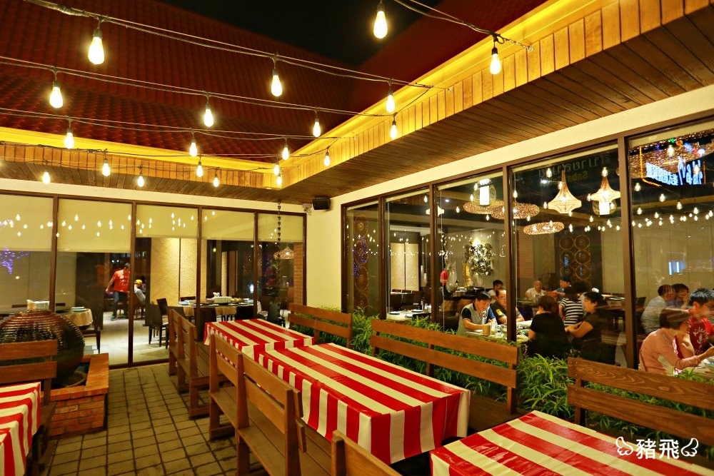 還沒抵達餐廳就在遠處看見這裡亮著溫暖黃光,把附近給照亮,半空中高掛的燈泡像是正在進行一場夜間party,紅白相間活潑的紅白桌布搭配木桌木椅,超適合呼朋引伴來這裡,如果天氣不冷,很建議座戶外區感受不一樣的用餐氛圍喔。