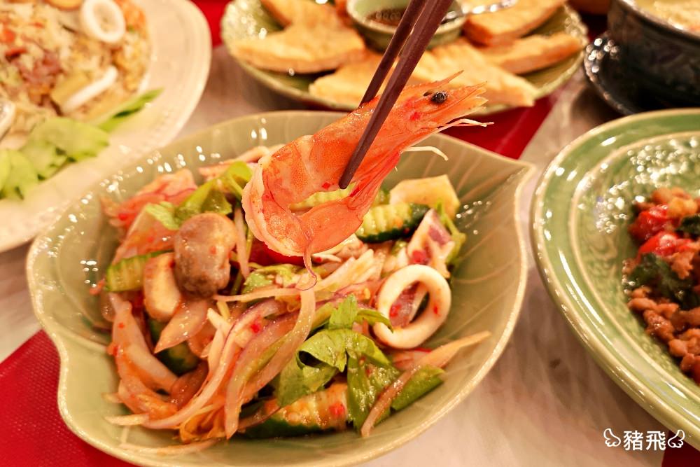 吃泰國菜必點的經典菜色『涼拌海鮮』,酸、甜、鮮、辣,而且辣度直逼喉頭,超夠味!已經貼心去泥腸的鮮蝦搭配雙色洋蔥絲、小黃瓜、洋菇、透抽,每一口都很開胃。