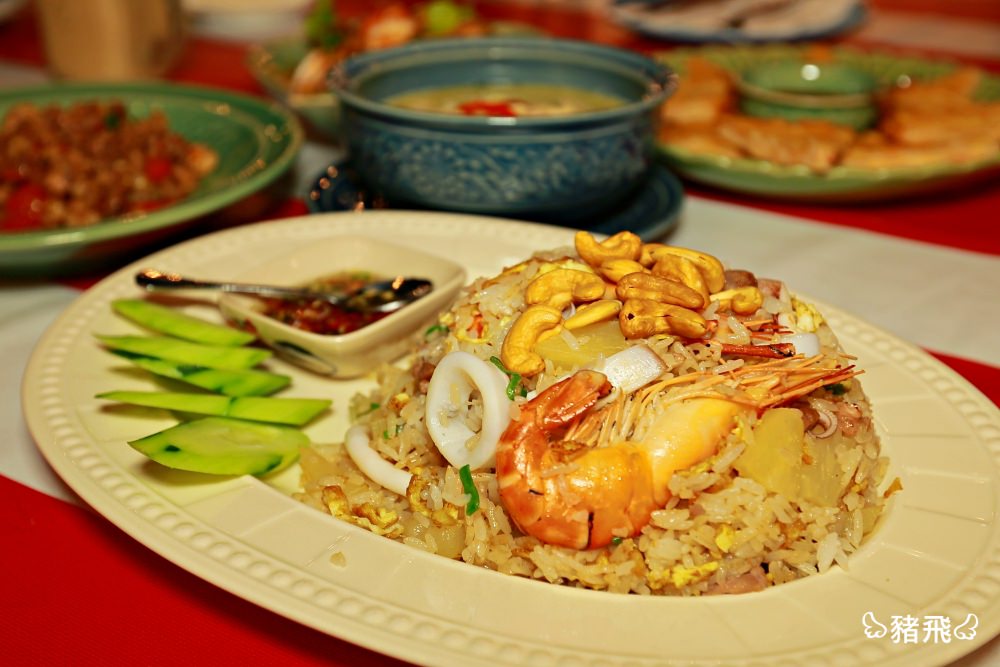 粒粒分明的炒飯是用鳳梨果肉入菜的南洋風味料理,加入透抽、泰國蝦、腰果,香氣十足!一旁的辣椒配醬用來提味,辣度對我們來說已經是大辣了,歡迎挑戰看看,吃一口飯要配好幾口水解辣才行。如果改用鳳梨殼裝盤上桌肯定更磅礡。