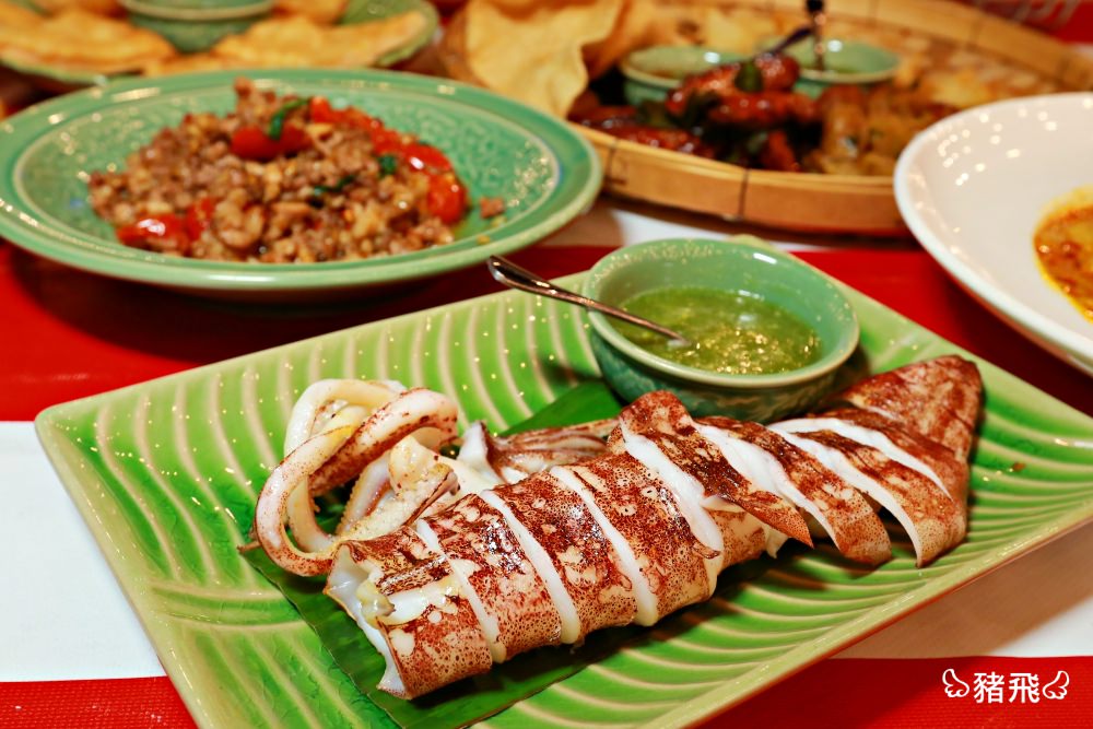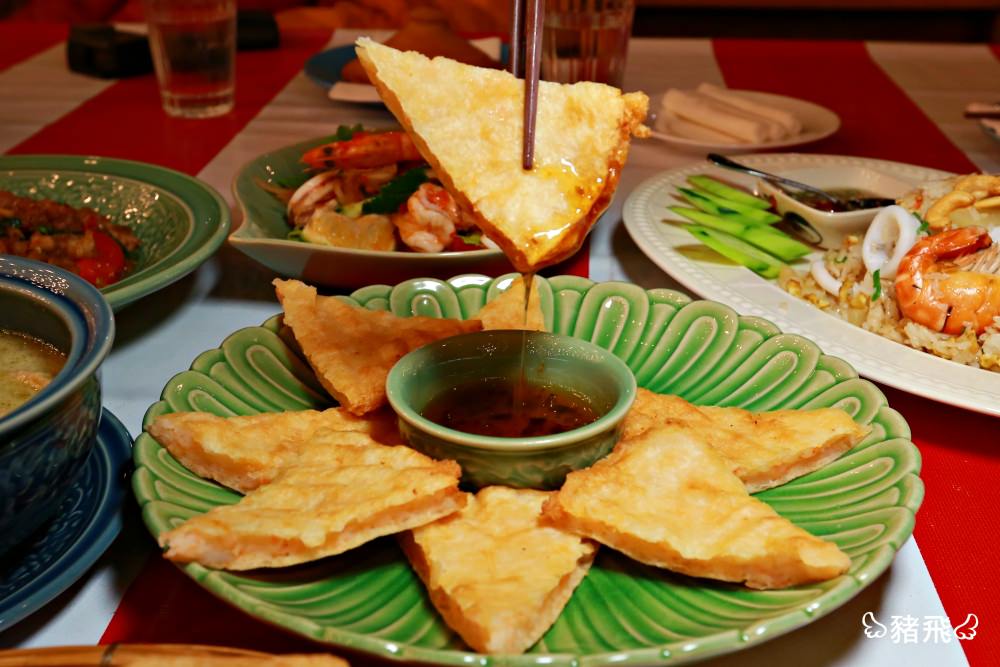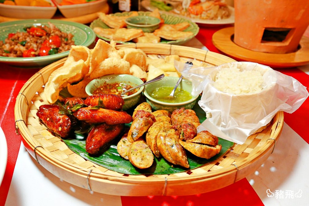 用編織竹盤上桌的金黃色炸物拼盤包含有辣香腸、蝦片、榴槤包、炸雞翅、糯米飯口味多樣豐富性十足。這樣的料理我在清邁吃過,其中可烤可炸的泰北香腸早已是人氣最高的清邁伴手禮也是本地人思鄉菜之一,想要試試不一樣的地方菜,就點這道囉!