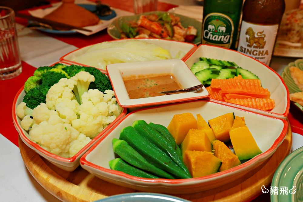 配色繽紛的燙青菜拼盤,有綠白花椰菜、高麗菜、小黃瓜、紅蘿蔔、栗子南瓜、秋葵,中間特殊醬料是這道菜的重點,辣度直衝腦門的特調魚露醬,適合喜愛大辣的朋友挑戰。