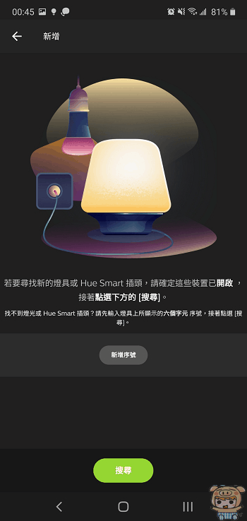 從iOS 或Android 下載Philips Hue App後,按下搜尋,當App搜尋到橋接器,這時只要按下橋接器上圓形處閃燈處,手機與橋接器便完成配對。