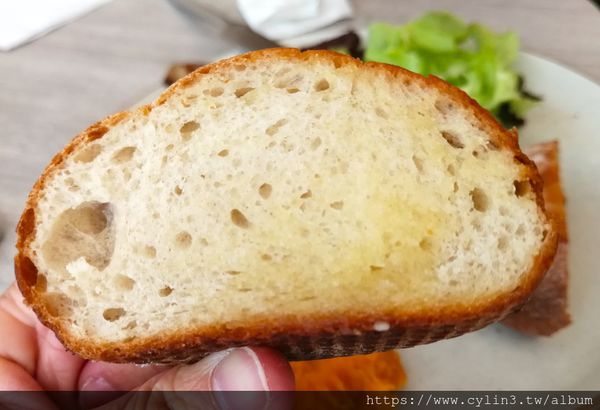 「小圓麵包」是店家自製的麵包,外酥內軟頗歐式,剖面可以看到有不少氣孔,咬起來有彈性越嚼越香,Janice喜愛極了!我個人吃軟不吃硬,還是愛法式吐司多一些,哈~