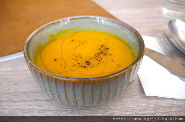 這日的主廚例湯為南瓜濃湯,新鮮南瓜與洋蔥熬煮到非常細緻鮮甜,上頭再撒上些許橄欖油與黑胡椒添增香氣,口感也更佳柔順;我也注意到湯碗很有質感,「Topo Cafe 拓樸本然」這點小細節都沒有馬虎哩~