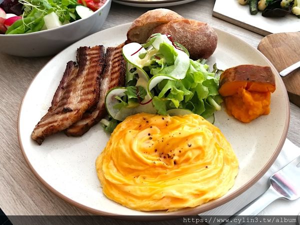 沙拉一樣是4~5種時蔬沙拉淋上特製奶油乳酪,我就不再介紹了,視覺上讓我們比較衝突的是「炒蛋」,原以為是一般「炒蛋」,沒想到是有些技術的螺旋蛋,Janice咬下時驚呼這蛋不一樣,一層層的蛋堆疊,比玉子燒更細嫩,蛋奶香濃郁,我們還忍不住詢問店員是他們自己煎的嗎?想說來當工讀生學這道「炒蛋」料理回內湖737開個小攤,應該會炙手可熱耶~(大笑)