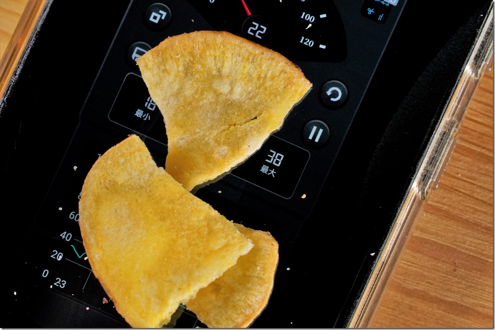 所以拿起包裝端詳一下,是嚴選台灣在地農作,這點非常可以,支持台灣農作瞬間讓我罪惡感少了一半。加上還有經過多項檢測,並採用低溫真空油炸,這好像比起一般洋芋片要健康一點。