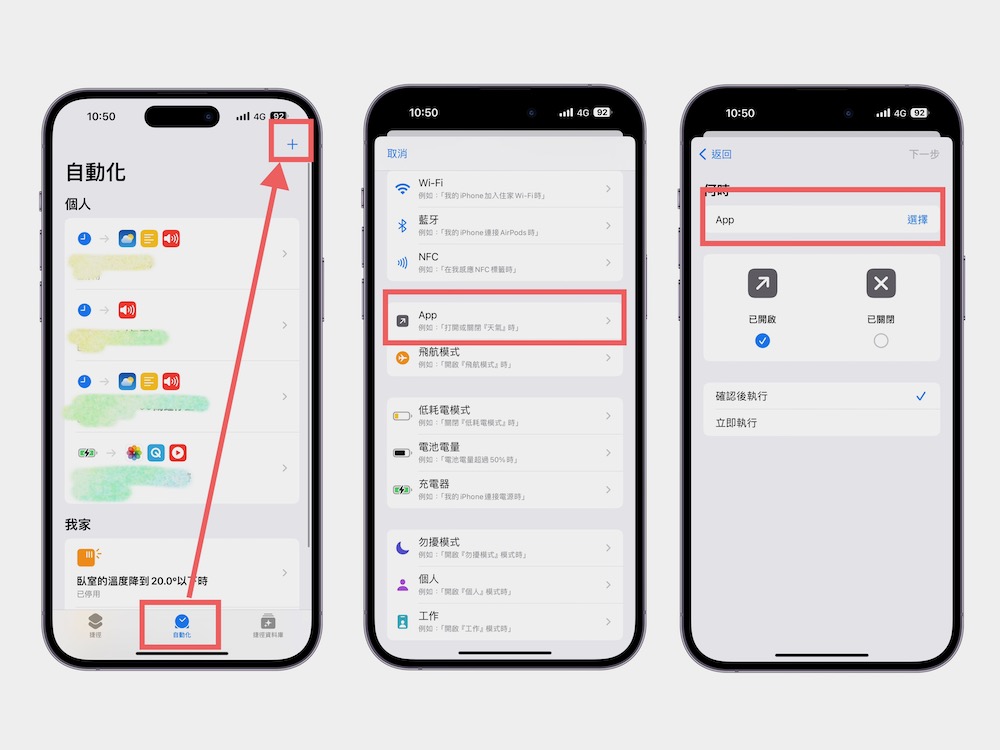步驟 1、依序打開「捷徑」,選擇下方的「自動化」後按右上角的「+」 來準備新增一個自動化動作。