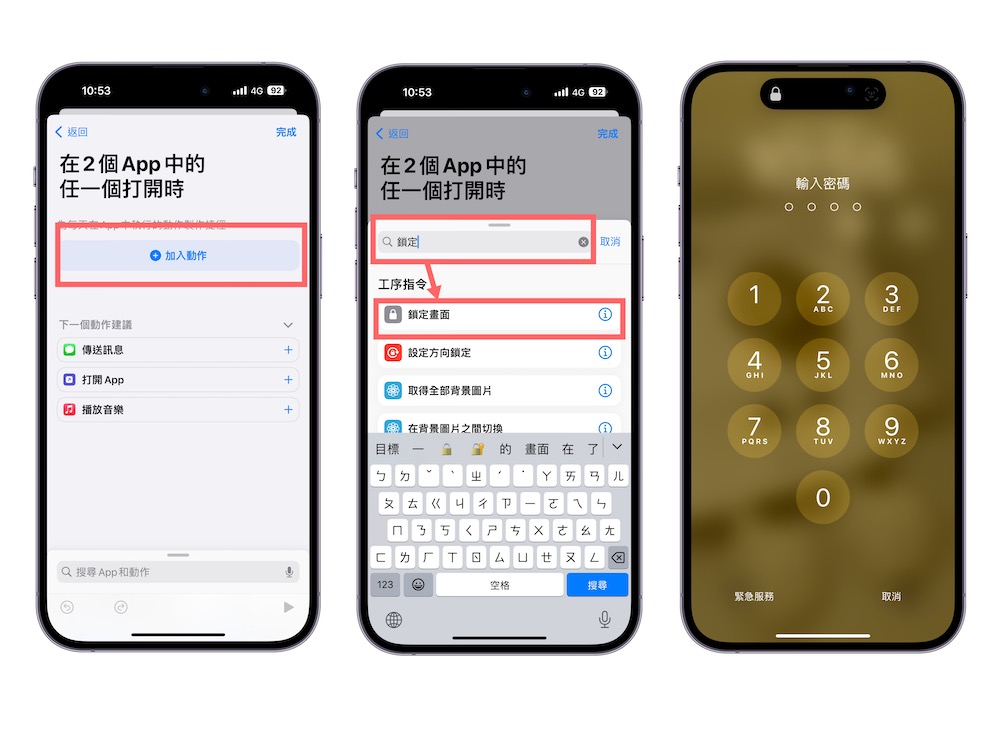 步驟 6、在「加入動作」中搜尋「鎖定」後會看到「鎖定畫面」的工作指令,選擇後按下完成,這個自動化動作就大功告成。