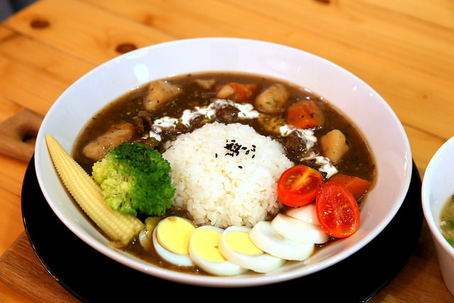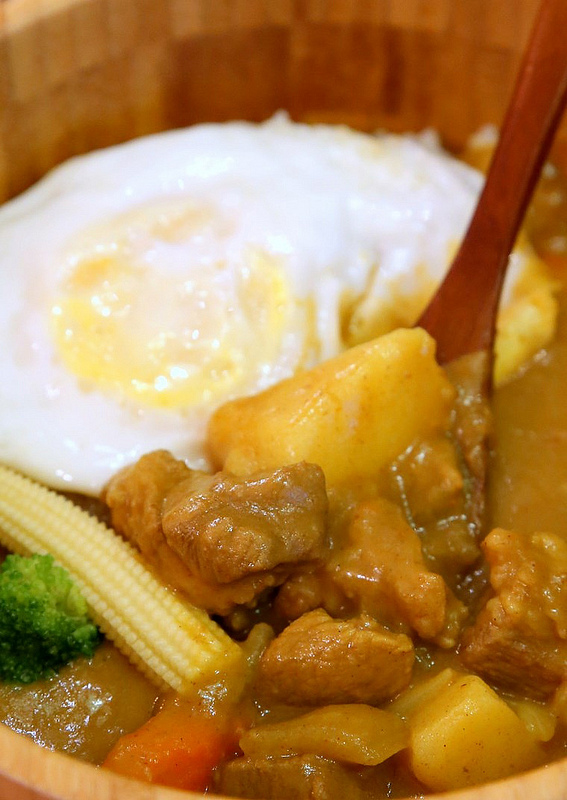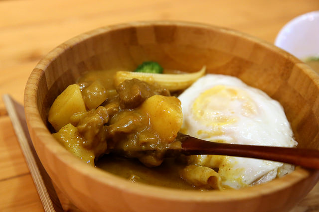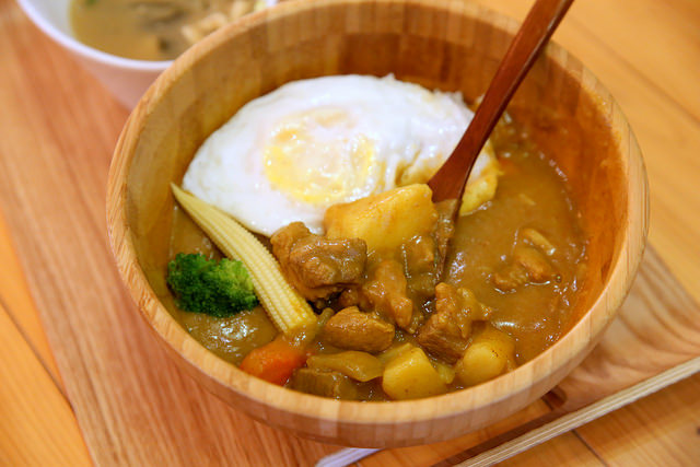 用木碗盛裝的【阿嬤古早味咖哩飯】,用湯匙大口大口挖著吃特別有味道,豬肉肥瘦都有,咬起來彈牙,嚼兩口就能感受到微辣的口感和肉味均勻的混合在一起,非常爽口!