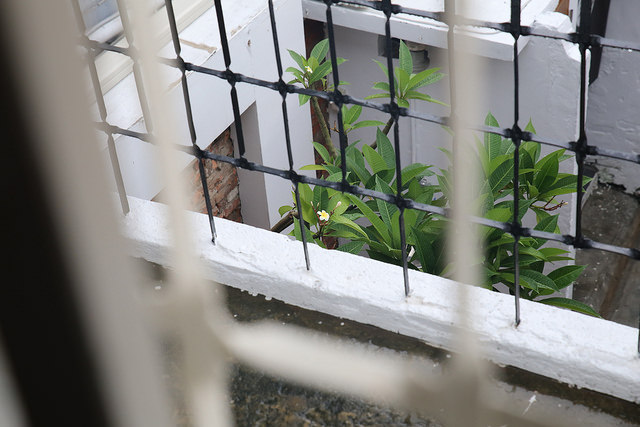 從二樓往下看去,庭院裡的雞蛋花是南台灣特有的風情,可惜這株太年輕,氣勢不足。