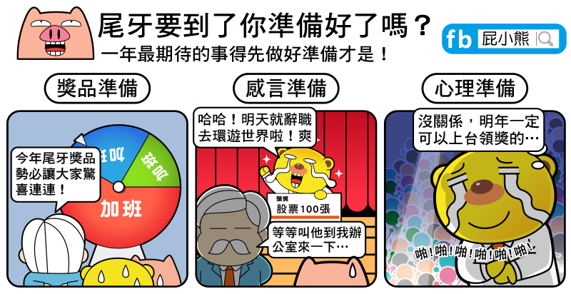 屁小熊 2014/12/29瀏覽: views 年度大事「尾牙」就快登場了!這麼重要的活動,你…準備好了嗎!而又該準備哪些呢? 獎品準備 這無疑是最重要的一件事了!該準備什麼樣的獎品才能讓員工們開心呢?這真是老闆的一門課題啊! 感言準備 雖然不是人人有大獎,但每個人都想中大獎,假如真的中了~上台請不要結巴!大聲的說出你的歓備好的得獎感言吧!! 心理準備 只能說,戲棚下站久了就是你的~大獎不是人人有的,所以也別太在意了,跟自己說總有一天自己會是站上台的那一位吧! 搞笑漫畫讓大家開心點一起來迎接尾牙吧~ 由屁小熊的小冊日記貼文。 Related Items尾牙屁熊內褲豬 好有趣 2014/12/29瀏覽: views 屁小熊 愛分享上班搞笑的屁熊還有內褲豬,職場不開心的話就快來找我們 ■作者:屁小熊 ■主題:職場、漫畫、生活、搞笑 ■個人網站:https://padbear68ee07.blogspot.com/ ■FB粉絲團:https://www.facebook.com/ppbear123 ■連絡方式:197968ee07@gmail.com Related Items尾牙屁熊內褲豬 next page