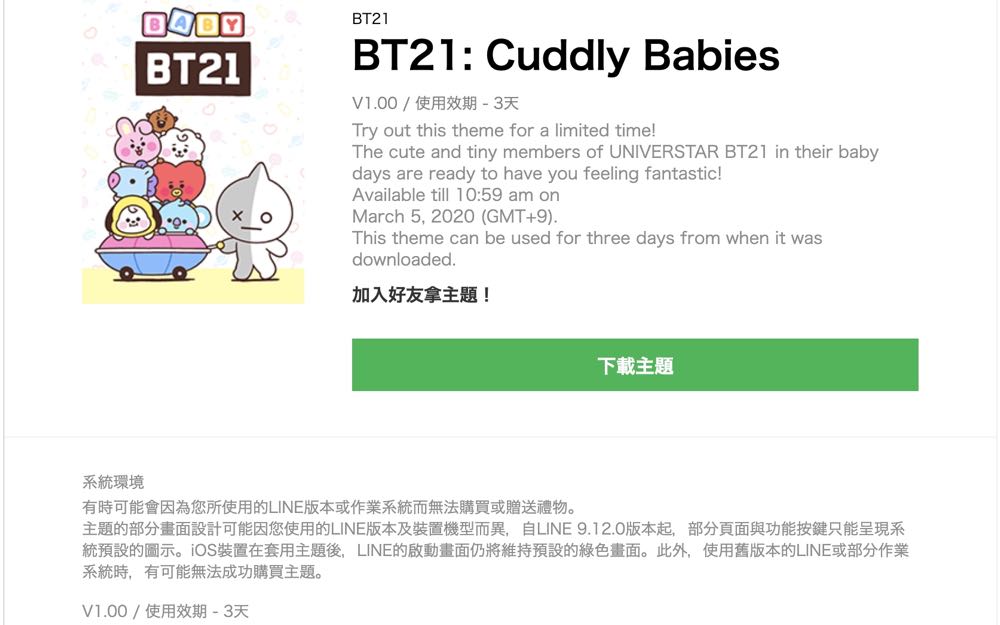 LINE 限時免費主題 – BABY BT21 台灣限定!