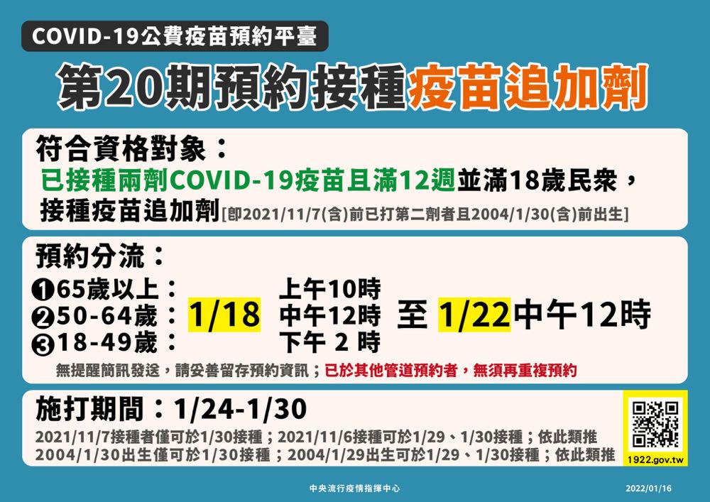 1922 疫苗平台第20期 1/18 開放預約 加入「台北市」與「高端」 2 選擇!