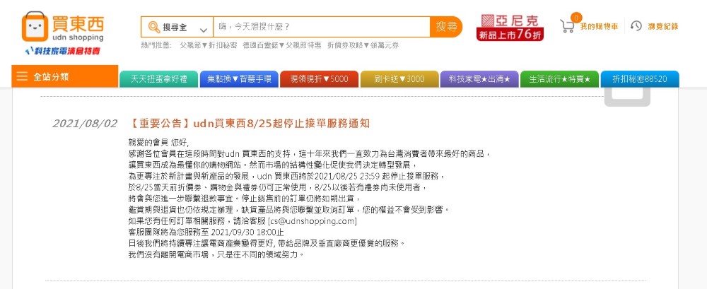 聯合報電商「udn 買東西」宣布 8 / 25 停止接單