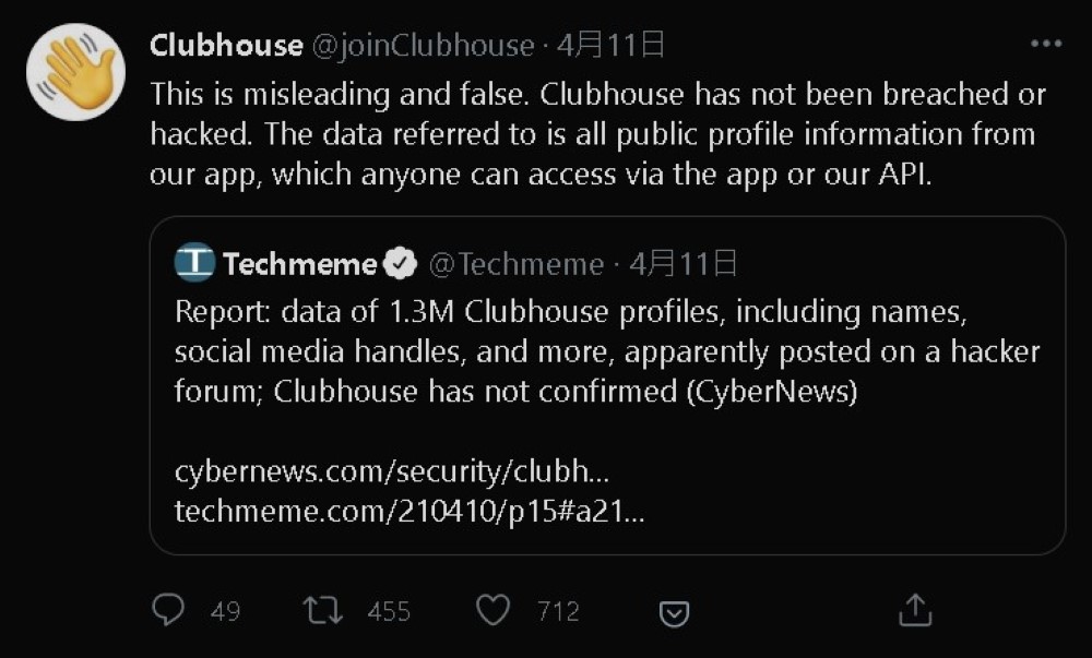 「Clubhouse 超過 130 萬用戶個資外洩」是錯誤資訊